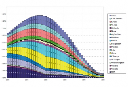 Come si può vedere, le emissioni globali, che sono espresse sull'ordinata in Gtc ovvero gigatonnellate di carbonio ovvero miliardi di tonnellate di carbonio, all'anno devono al più presto scendere e tendere a zero nel 2050, a livello dei singoli paesi la situazione è variegata: quelli occidentali - storicamente e attualmente grandi emettitori pro capite - devono ridurre drasticamente le emissioni annue, mentre quelli del Sud possono ancora aumentarle per un po' (si vedano Cina e India ad esempio, e ancor più Africa e Bangladesh che adesso hanno responsabilità climatiche ridottissime). Così in pochi decenni si dovrebbe arrivare a uguali emissioni pro capite.