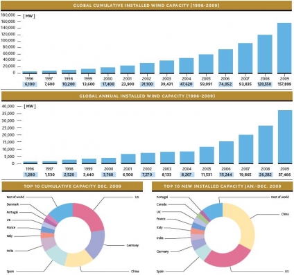 Un terzo di questa crescita viene dalla Cina, che ha registrato per il quinto anno consecutivo un aumento dell'eolico superiore al 100%. Secondo il segretario generale del Gwec, Steve Sawyer, «La crescita rapida e costante di energia eolica, nonostante la crisi finanziaria e la recessione economica testimonia l'attrattività intrinseca della tecnologia, che è pulita, affidabile e veloce da installare. L'energia eolica è diventata la power technology scelta da un numero crescente di Paesi in tutto il mondo. Copenaghen non ci ha avvicinato ad un prezzo globale del carbonio, ma l'energia eolica ha continuato a crescere grazie alle politiche energetiche nazionale nei nostri principali mercati ed anche perché molti governi hanno dato priorità allo sviluppo delle energie rinnovabili nei loro piani di ripresa economica. L'energia eolica sta già dando un contributo significativo alla riduzione delle emissioni di CO2. I 158 GW di potenza eolica installati alla fine del 2009 produrranno 340 TWh di energia elettrica pulita e un risparmio di 204 milioni di tonnellate di CO2 ogni anno. Come si vede in Europa e negli Stati Uniti, l'energia eolica è oggi spesso l'opzione più interessante per la produzione di nuova energia, sia in termini economici e ambientali, e per migliorare la sicurezza dell'approvvigionamento».