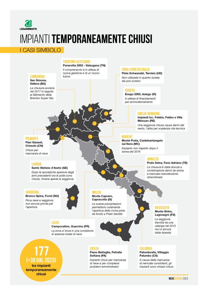 Il Cigno verde informa infatti che sono 177 gli impianti temporaneamente chiusi nella Penisola (+39 unità rispetto al report precedente), di cui 92 sull’arco alpino e 85 sull’Appennino.