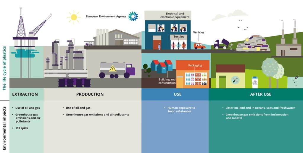 I dati dell’inventario dei gas serra dell’Eea evidenziano che le emissioni annue connesse alla produzione di plastica nell’Ue ammontano a circa 13,4 milioni di tonnellate di CO2, pari a circa il 20 % delle emissioni dell’industria chimica in tutta l’Unione europea. Il rapporto fa notare che «La sostenibilità economica del mercato europeo e mondiale del riciclaggio della plastica è attualmente sottoposta a forti pressioni. Anche la riduzione della domanda di plastica riciclata da parte del mercato ha reso più difficile a molti Comuni europei gestire in modo sostenibile le proprie prassi in materia di rifiuti; di conseguenza, opzioni di smaltimento dei rifiuti meno adeguate sono utilizzate per quantità notevoli di rifiuti di plastica».